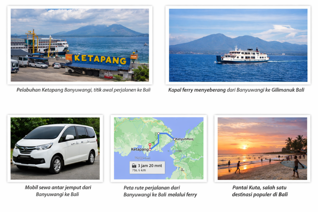 Perjalanan dimulai dari Banyuwangi menuju Pelabuhan Ketapang. Dari pelabuhan ini, penumpang menyeberang menggunakan kapal ferry menuju Pelabuhan Gilimanuk, Bali. Waktu tempuh ferry rata-rata sekitar 45–60 menit, tergantung cuaca dan antrean.